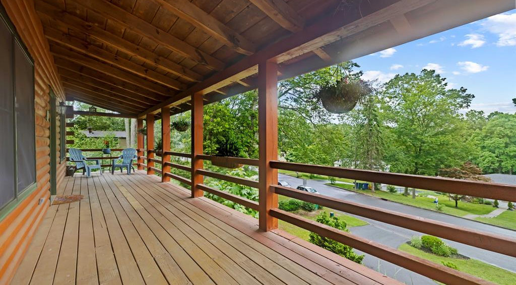 Tucked away on a beautifully terraced lot, this handcrafted log home offers a peaceful retreat surrounded by mature trees and manicured gardens. A curved stone walkway and tiered landscaping lead to a charming wraparound porch—an inviting welcome that sets the tone for the warmth found inside.